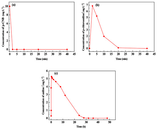 Figure 8 shows the variation in the concentration of p-CNB, p-CAN and AN over time. In Figure 8a, p-CNB is completely removed within 2 min after n-Fe/Ni is added. This is because Fe0, as an electron donor, reduces –NO2 on p-CNB into the –NH2 group (Equation (1)), so that p-CNB is converted to p-CAN. Meanwhile, Ni and Fe0 form the Fe-Ni galvanic cell, which accelerates the electron loss in Fe0 corrosion and further hastens the electron transfer rate. The concentration of p-CAN reaches its peak (6.8 mg/L) at 2 min and then decreases to close to 0 at 20 min (Figure 8b). In the meantime, Figure 8c indicates that the concentration of AN reaches its peak (5.2 mg/L) at 20 min. This demonstrates that p-CAN has been completely converted to AN.