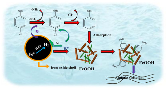Based on these analyses, a schematic representation of the process and mechanism of the coupling removal of p-CNB, p-CAN and AN by n-Fe/Ni-FeOOH is shown in Figure 9.