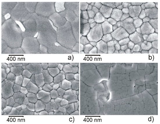 Surface SEM images of the formed perovskite films. Cs concentration (in %) is: (a) 0, (b) 10, (c) 20, (d) 40. Magnification is 100,000×.