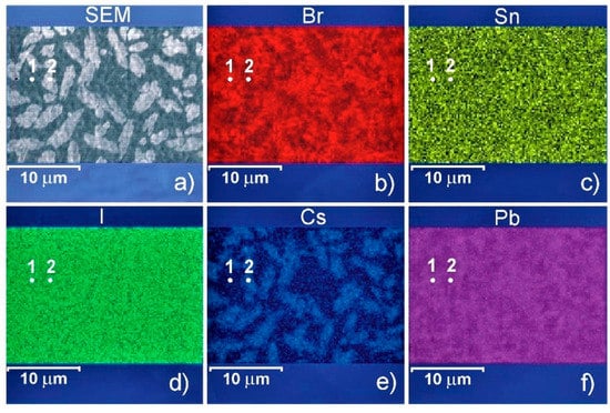 As Figure 3 shows, the EDX images confirm that Br, Sn, I, and Pb elements are homogeneously dispersed while Cs is segregated into 2–5 m-size islands. The details of the elemental composition of the sample surface at points 1 and 2 are presented in Table 1.