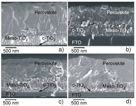 Morphological changes of the same perovskite samples are significantly less pronounced in the cross-sectional SEM images (Figure 4). At higher Cs concentration (20% and 40%), the perovskite layers look amorphous since crystals or crystalline aggregates (conglomerates) are hardly visible (Figure 4c,d). The thickness of the perovskite films grown on meso-TiO2 is in the range of 850 nm to 1100 nm.