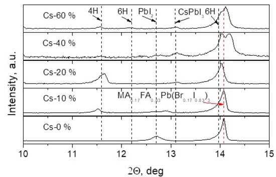 Influence of Cs on structure and phase composition of the formed perovskite layers was studied by the XRD technique with Cs concentration ranging from 0 to 60%. Figure 5 shows fragments of the measured XRD patterns.
