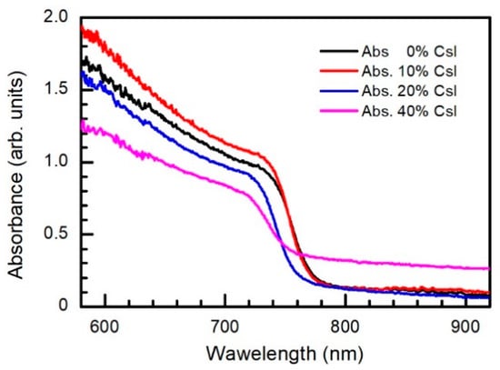 The measured absorbance spectra of the perovskite Csx(MA0.17FA0.83)1−x Pb(I0.83Br0.17)3 films with different cesium concentration are shown in Figure 6.