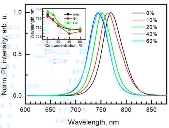 Photoluminescence spectra of the perovskite layers are shown in Figure 7. Increase in Cs concentration shifts PL maximum to the blue side. However, the red shift is detected in the sample with the highest, 60%, concentration. Similar tendencies were observed in references [49,80]. This red-shift could be explained by the presence of the second cubic or hexagonal 6H polytype of perovskite as mentioned above.