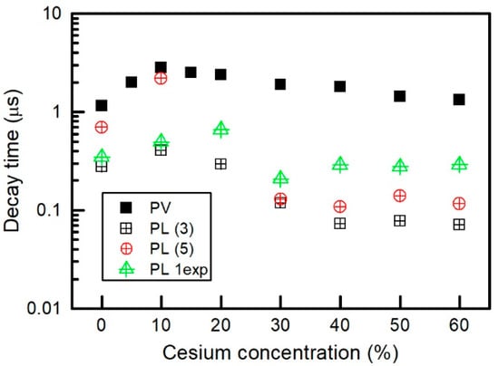 The fitting results are also presented in Table 2 and Figure 8. The averaged decay time constants obtained by means of Equations (3) and (5) show the same tendency; see, respectively, PL (3) and PL (5) in Figure 8. The only exception is the sample with 20% of Cs whose averaged decay time constant given by Equation (5) goes to infinity. For comparison, we extracted one-exponent decay time constant ranging from 400 ns up to 700 ns (see PL 1 exp in Figure 8).
