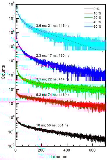 where τi and Ai are the decay time constant and the amplitude of the ith component, respectively. However, only at least three exponents provided good fitting, and these results are shown in Figure 9 with corresponding time constant values.