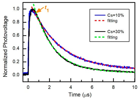 It is seen that, in a certain interval of time (t > t1), the decay of the photovoltage can be approximated as a simple exponential function , where Uph0 is the value of Uph at time t1, and τ is the characteristic decay time constant. The dependence of the transient photovoltage time constant on cesium concentration is depicted in Figure 8. PV and PL decay times increase only after addition of small amount of Cs, and later start decreasing. This dependence can be explained by the change in the layer quality that leads to reduction of the trap density and charge recombination rates in the perovskite layers [57]. Adding of Cs firstly minimizes the quantity of PbI2 phase, but later there appears CsPbI3 and other polytypes of the perovskite (see Figure 5). It is seen that all the photovoltage time constants have values higher than those obtained from the photoluminescence measurements. This difference could be explained by several reasons [85]. First, the real bulk carrier lifetime is masked by the combination of the surface recombination and self-absorption of reemitted photons in the volume of the perovskite layer. Therefore, the PL decay time can be shorter by an order of magnitude than the real bulk lifetime. Second, the photovoltage decay reflects the bulk recombination processes and produces a proper value of the latter. Third, in the case of a thin film, the transient photovoltage decay is strongly extended by the low ambipolar mobility resulting from the space charge-limited currents.