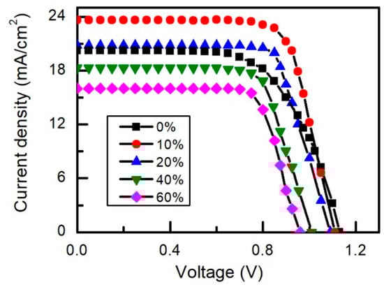 Figure 11 shows current-forward bias voltage characteristics of the fabricated perovskite solar cells with different cesium concentration. As expected, the cell containing 10% of cesium in the perovskite layer has the highest value of the short-current density Jsc. This is the result of the highest absorbance of the 10%-perovskite layer. This sample also demonstrates the highest values of the photovoltage and the PL decay time constants. It is worth noting that the current-voltage characteristics of solar cell containing 10% of Cs shows negligible hysteresis, just like it was observed earlier in References [49,58,75]. Significant hysteresis of the characteristic was observed only in the case of high cesium concentration (≥20%). This behavior might be related to the phase segregation within the cubic perovskite phase and to reduced crystallinity [79,80].