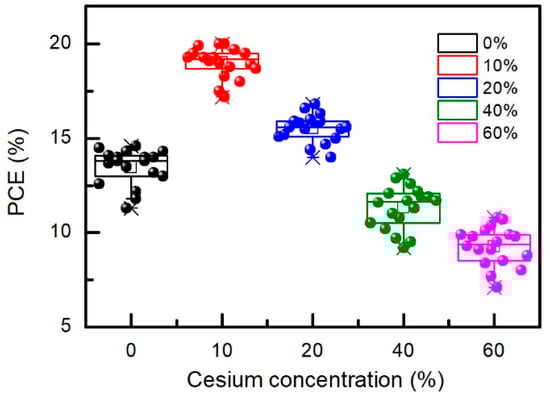 The values of photovoltaic quantities of the best perovskite solar cells are presented in Table 3, and statistics of the power conversion efficiency of 90 perovskite solar cells with different cesium concentration is depicted in Figure 12.