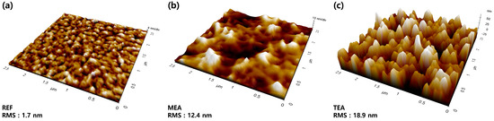 SPM images of the films prepared using different stabilizers after the high-temperature annealing process: (a) REF, (b) MEA, and (c) TEA.