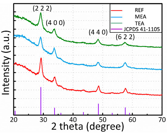 where D, λ, β, and θ indicate the crystalline size, X-ray wavelength (1.54 Å), full width at half the maximum of each diffraction peak, and peak position, respectively. The crystalline sizes calculated for the (2 2 2) plane were 11.4 nm (REF), 10.7 nm (MEA), and 9.6 nm (TEA).