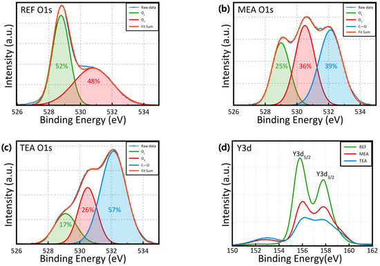 Figure 4 shows the chemical composition of the films analyzed using XPS. The XPS peaks were examined based on the Gaussian distribution. Figure 4a–c shows the O1s spectra, indicating three peaks that represented the oxygen ions combined with metal cations (OL), surface OV, and CO binding groups, with binding energies of 529.0, 530.7, and 532.1 eV, respectively. For the C–O binding groups, the binding portion increased from 0% for REF to 39% for MEA, and 57% for TEA after the addition of stabilizers. In Figure 4a, the Y3d peak comprised Y3d5/2 and Y3d3/2 components, with binding energies of 155.9 and 157.8 eV, respectively. These findings confirm the successful formation of the Y₂O₃ films. Moreover, no peak related to –Y–OH (~160 eV) was detected in the aforementioned spectra.