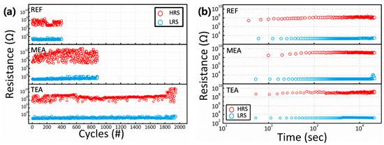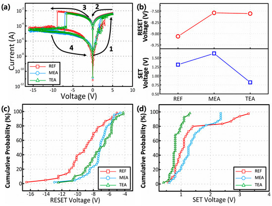 Based on the GIXRD data, the REF sample showed the largest crystalline size. The carrier mobility, related to the leakage current of the insulator, increases with an increase in the grain size, and is inversely proportional to the number of grain boundaries. The enhanced carrier scattering caused by the grain boundary decreases the leakage current. Based on the XPS data, the MEA and TEA samples showed lower Ov proportions compared to REF samples. Ov is generally recognized as a defect in oxides, acting as a trap to enable trap-assisted tunneling or hopping mechanisms. The suppression of OV suppresses the current flow, which decreases the leakage current by eliminating the defects in the oxide films. These phenomena decrease the leakage current and increase the HRS. Figure 5b shows the average values of the SET and RESET voltages. The devices fabricated using the TEA-added precursor solution showed the lowest SET and RESET voltages. The comprehensive charge concentration, and efficient charge injection and transport afforded a low-voltage operation through the enhanced local electrical field [28,29]. The cumulative probabilities of the RESET and SET voltages are plotted in Figure 5c,d, respectively. Compared with the REF device, the MEA and TEA devices showed a statistically improved uniformity in the SET and RESET voltages.