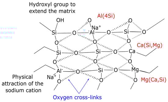 Bouaissi et al. [114] discovered that the free cation Mg2+ leads to the formation of intermolecular bonding with Si4+ and Al3+ by the sharing of oxygen atoms, as depicted in Figure 4. A similar model was proposed by Zhang et al. [128], who also stated that the presence of Mg2+ provides chemical stability (interatomic bonding) in the geopolymer matrix as reflected in the formation of Si-O-Mg, Si-O-Al/Si and Ca-O-Si. The reaction mechanism of the alkali activation of slag is more complicated than fundamental geopolymers due to the significant amounts of calcium, magnesium and iron. Hence, it is essential to study the role of these elements in each slag waste material and hydration process.