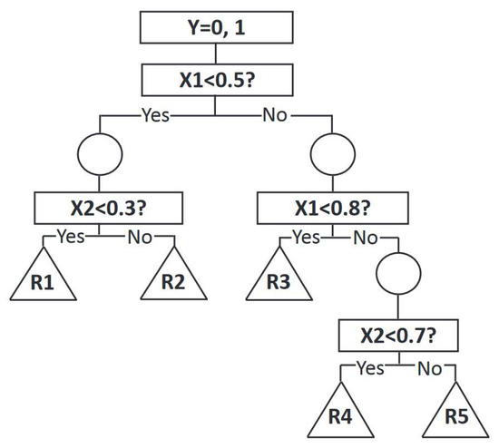 The example tree in Figure 1 shows a binary target variable is classified to either Y = 0 or Y = 1, based on two predictors, X1 and X2, whose values range from 0 to 1. Nodes and branches constitute the essential components of a decision tree model. During the development of the decision tree, three processes take place, splitting, stopping, and pruning [32]. There exist many algorithms that implement decision trees, such as classification and regression trees (CART) [31], C4.5 [33], Chi-squared automatic interaction detection (CHAID), and QUEST, which is the abbreviation of quick, unbiased, efficient, statistical tree [34].