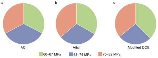 Training data produced by the mix design programs showing uniformity in distribution of compressive strength in the three classes: (a) ACI, (b) Aïtcin, and (c) Modified DOE.