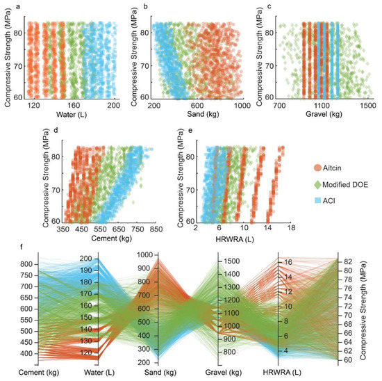Figure 2 shows distribution of strengths of the concrete mixes produced from each method. Pie charts show that for each mix design method, the designed mixes contain uniformly distributed strengths. The relationships between mix ingredients and strength are not always clear, and intricate overlaps are present between design methods, making it a very challenging task to distinguish the design method based on mix proportions for a specified compressive strength, see Figure 3a–e. This difficulty can be clearly observed when parallel lines of all mixes produced by all three methods are overlapped, see Figure 3f. The overlap that exists between the paths leading to the required strength clearly shows how it is very difficult to tell which method was used to design which mix, hence necessitating a machine learning algorithm to tell them apart.