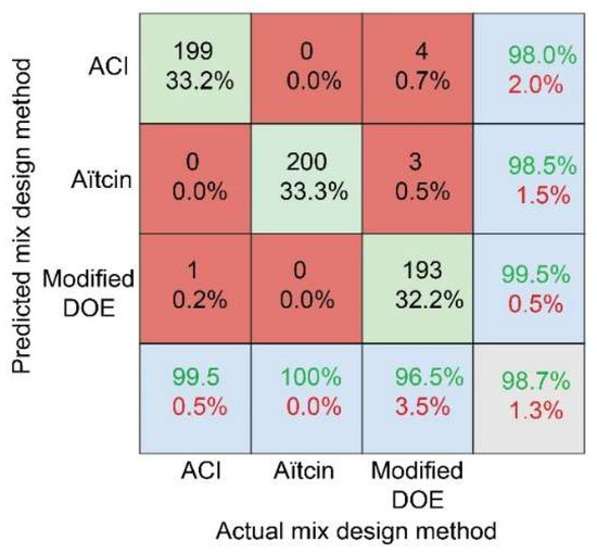 In concrete technology, we seldom talk about the amount of cement and amount of water separately; instead, we use the water/cement ratio or (W/C) for short. It can be speculated that the W/C can be of importance in the determination of mix design method; however, as it is merely a linear combination of two features, then its information is already embedded in the training dataset and hence its contribution to the outcome variable may be limited. In addition, the current set of features aided in classifying the mix design methods with very high accuracy, eliminating the need for more features.