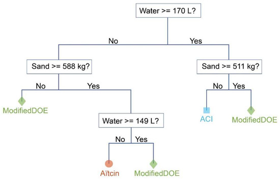After only using principal predictors (amounts of cement and water) in training the tree model, ROC was used to test the performance of the reduced models. Figure 4d presents ROC curves, which show the performance of the reduced tree classifier on training data. ROC curve of ACI-vs-rest, with ACI assigned as the positive class and the other methods assigned as the negative class, shows that the AUC for the reduced model is 0.95, which indicates that the classification performance was slightly affected by the omittance of some of the features. In the case where Aïtcin method was assigned to be the positive class and the other methods to be the negative class, Figure 4b, the AUC was found to be 0.96, which indicates that the performance of the classifier was also slightly affected by the omittance of some of the features. For the case where modified DOE was assigned to be the positive class and the other methods to be the negative class, the classification performance was greatly affected by the omittance of some of the features with an area under the curve of 0.89.
