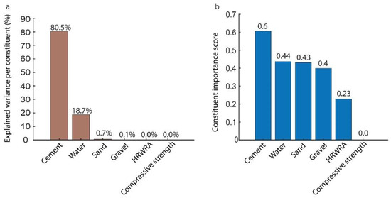 The fine tree classifier was re-trained, however, with enabling principal component analysis this time around, to determine feature importance. The PCA-enabled fine tree classifier kept two features, which can explain 95% variance. Explained variance per feature was found to be the amount of cement: 80.5%, amount of water: 18.7%, amount of sand: 0.7%, amount of gravel: 0.1%, and 0.0% for both the amount of HRWRA and concrete’s compressive strength. Results of PCA is shown in Figure 7a.