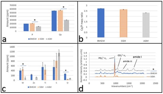 In Figure 1a–b, we plot the Ca and P amounts and the Ca/P ratio from the XRF analysis of the materials tested. From Figure 1b, we find that the ratios are similar between the samples. From the XRF, we also found a small but statistically significant number of other impurities in the samples, which are plotted in Figure 1c. From the figure, we see that among these impurities, none of them have reported toxicities to human cells at the ppm levels, except for tungsten, where studies have shown that it is toxic at concentrations above 184 ppm [18]. From Figure 1c, we find that both the bovine (BMGM) and the synthetic (SGM) bone chips significantly exceed this amount, at 400 ± 77 ppm and 463 ± 73 ppm, respectively, while the human bone chips are significantly below this value, with 92 ± 42 ppm.