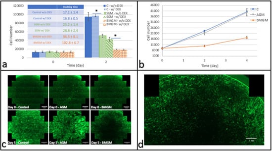 DPSCs cultured with bone graft materials on tissue culture plastic: (a) Cell numbers on days 0 and 2 after plating with and without DEX (n = 3) Inset: Corresponding doubling times (hours), with and without DEX. (b) Cell counts as a function of time in culture (w/o DEX) where * indicates p << 0.01 (c) fluorescence images of the entire well of eGFP DPSC (scale bar: 2 mm) at days 0 and 5 after addition of AGM or BMGM; Control wells received no additions. (d) Magnified fluorescence image of the well containing cells cultured with BMGM for 5 days (scale bar: 1 mm) showing a zone of exclusion around the region where the bone grafts were placed.