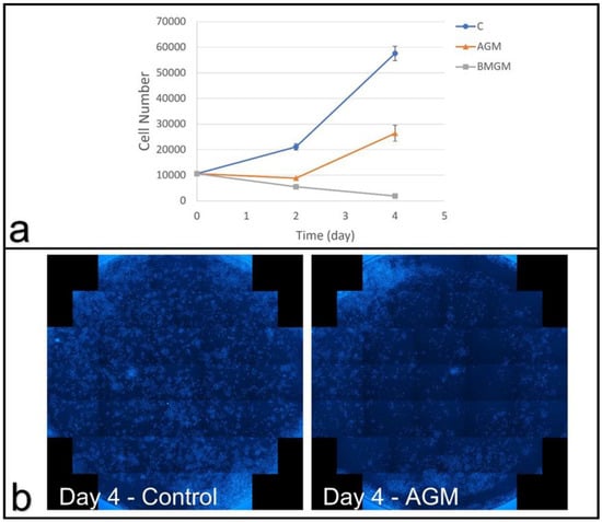 Saos-2 cells cultured with bone graft materials on TCP: (a) growth curves, and (b) fluorescence images of DAPI stained cell nuclei for the whole well showing the control group, without bone graft materials, and the group with AGM.
