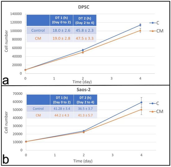 Growth curves and doubling times of cells cultured with conditioned media (CM) and control, without conditioned media (C)): (a) DPSCs and (b) Saos-2 cells.