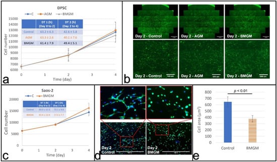 In vivo, collagen is the most abundant component of the extracellular matrix for both DPSC and Saos-2. We, therefore, exposed both types of cells to BMGM to determine if toxicity persisted under those conditions as well. In Figure 5a, we show the growth curves and doubling times of the DPSCs cultured on collagen matrices in the presence of AGM and BMGM, as well as the control. From the figure, we can see that while the doubling times are longer for all samples on collagen, no significant difference can be discerned between the control culture or those with both types of bone chips. From the fluorescence images shown on the first row in Figure 5b, we also see that the cell density and extent of coverage are uniform across all samples. On the second row in Figure 5b, we plot magnified sections, where we can see that the cells are well extended and no differences in morphology is observed.