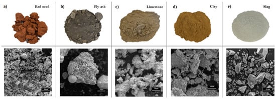 Visual appearance of as-collected raw materials (top image) and their particle appearance obtained with SEM (bottom image) used for morphological comparison: (a) red mud (RM), (b) fly ash (FA), (c) limestone (LS), (d) clay (C), (e) slag (SL).