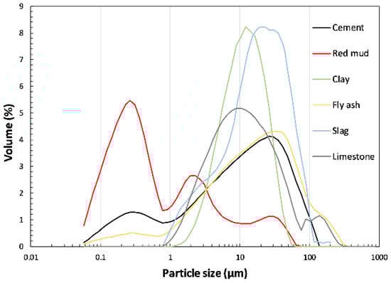 The red mud sample contains a considerable amount of iron oxide and highest content of sodium oxide compared to other used materials which is connected to its origin. Fly ash and clay samples are rich in silicon dioxide and alumina. Both materials have a sum of pozzolanic oxides (SiO2, Al2O3 and Fe2O3) higher than 80% according to the European standard for fly ash for concrete EN 450:1 []. Considering C618—19ASTM [] fly ash is classified as class F fly ash with a calcium oxide amount lower than 18% and SO3 amount less than 5%. Slag is rich in silicon dioxide and contains a considerable amount of calcium oxide. Most material samples have a sum of pozzolanic oxides higher than 70% concerning EN 450:1 [] except limestone powder which is mostly composed of calcium carbonate. The particle size distribution in volume fraction obtained by laser diffraction (Mastersizer 2000 instrument (Malvern Panalytical, Malvern, UK)) is given in Figure 2.