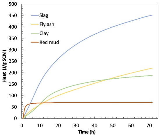Figure 3 displays the reactivity of the materials used in this study, which was determined by the R3 test method using isothermal calorimetry. Slag showed the highest heat release over 3 days of testing (total heat 451 J/g SCM) and was the most reactive material among those shown in Figure 4. The red mud sample showed the highest initial reactivity, after which the heat remained constant and showed the lowest heat release after 3 days (total heat 69.3 J/g SCM). Fly ash and clay exhibited similar behaviour after three days. In the first 45 h, clay sample showed higher reactivity than fly ash, but after 45 h, reactivity of fly ash was higher. Fly ash sample developed a higher heat of hydration (220 J/g SCM) than clay sample (190 J/g SCM) after three days.