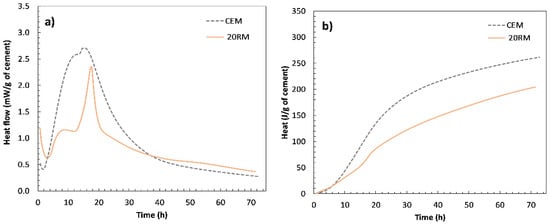 Heat flow (a) and cumulative heat curves (b) of reference paste (CEM) without substitution and of paste (20RM) with 20 wt.% red mud (RM) obtained by isothermal calorimetry.