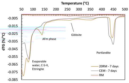Formation of aluminate phases was confirmed with TGA performed after 7 days of hydration, Figure 5, where a peak between 110–160 °C for system with red mud could be explained by the formation of aluminate AFm phases [,]. The AFm peak in the case of cement with red mud is significantly more pronounced compared to OPC system.