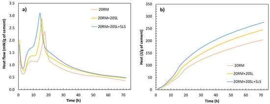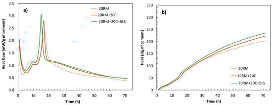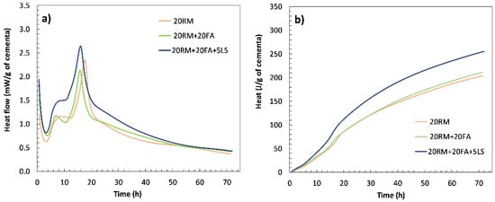 Figure 4 shows the heat of hydration of the reference sample (OPC) paste without any substitution and the paste with 20 wt.% cement substituted by red mud (RM) measured by isothermal conduction calorimetry during 72 h. In Figure 4a,b, heat flow curve and cumulative heat curve are shown, respectively. The plots are normalised to Portland cement content in the mortar, i.e., to mass of cement, to allow clear differentiation of the contribution of the red mud to the heat evolution. In a typical isothermal calorimetry curve for the hydration of ordinary Portland cement, the first peak generally corresponds to the hydration of the silicate phases, while the second peak is generally associated with the reaction of the aluminate phases [].