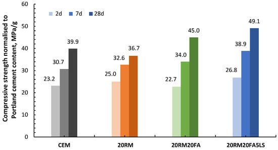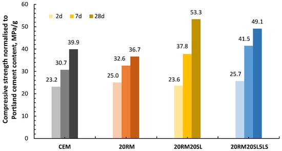 Compressive strength normalised to Portland cement content at 2, 7 and 28 days of mortars with 20 wt.% cement substitution by red mud, with additional 15 and 20 wt.% cement substitution by clay, without and with 5 wt.% cement substitution by limestone.