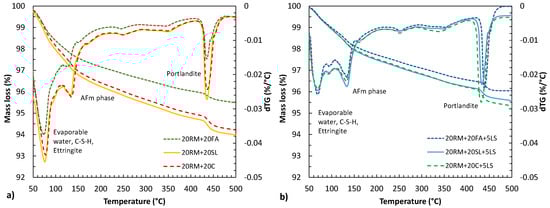 The first main peak observed in all mixes ranged between 50 °C and 100 °C and could be attributed to the decomposition of C-S-H, CAH and ettringite [,,]. This peak appeared to decrease with the addition of limestone to the mixture, especially with prolonged curing. The second main peak appeared in the range between 110 °C and 160 °C. In the reference sample, Figure 5, without clinker replacement, this peak was not as pronounced as in all other mixes. This could indicate the formation of AFm phases []. When comparing fly ash to clay and slag mixes on Figure 12a, it can be observed that the AFm peak was less pronounced, which is in accordance with the lower compressive strength of the mix with red mud and fly ash. With the addition of limestone, the curve changed, and most likely the limestone caused the formation of calcium carboaluminate instead of calcium sulfoaluminate, which could provide an explanation for the increased compressive strength []. The third peak between 400 °C and 500 °C is attributed to the dehydroxylation of portlandite. With higher cement replacement, the volume of hydration products decreases. This is especially the case with Portlandite peak, which decreased in the system with more fly ash.