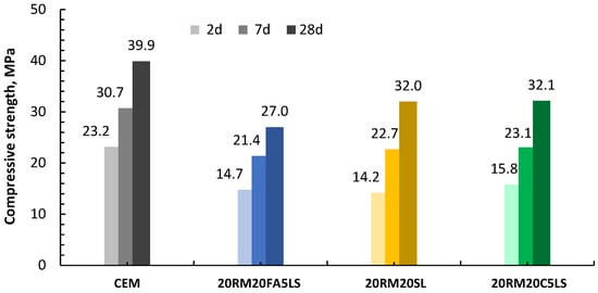 From the results of compressive strength per mass of cement, Figure 9, it can be seen that the addition of slag in the system helps to increase the compressive strength, especially at later stages. In addition, the presence of limestone increased the early strength, which is consistent with the increased heat of hydration. Such an influence of limestone on early strength increase was also reported in other studies []. However, the presence of limestone did not lead to an increase in strength after 28 days, as was the case in systems with fly ash. The absence of the effect of limestone on compressive strength after 28 days could be due to the fact that slag bears a lower alumina content than other materials [].