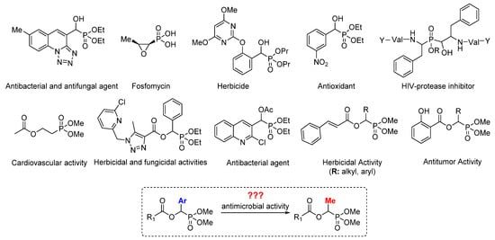 The following supporting information can be downloaded at: www.mdpi.com/article/10.3390/ma15051975/s1. Figure S1: Examples of MIC and MBC on microplates with different concentration of studied compounds (mg L−1). Figure S2: An example of an agarose gel electrophoresis separation of isolated plasmids DNA from R4 strains modified with selected compounds. Figure S3: An example of an agarose gel electrophoresis separation of isolated plasmids DNA from R4 strains modified with antibiotics: cloxacilline, ciprofloxaclinie, and bleomycine digested (or not) with repair enzymes Fpg. Figure S4: 1H NMR (400 MHz, CDCl3) of dimethyl hydroxy-(2-nitrophenyl)methylphosphonate (2). Figure S5: 31P NMR (162 MHz, CDCl3) of dimethyl hydroxy-(2-nitrophenyl)methylphosphonate (2). Figure S6: 1H NMR (400 MHz, CDCl3) of dibenzyl (1-hydroxy-2-phenylpropyl)phosphonate (4). Figure S7: 31P NMR (162 MHz, CDCl3) of dibenzyl (1-hydroxy-2-phenylpropyl)phosphonate (4). Figure S8: 1H NMR (400 MHz, CDCl3) of 1-(dimethoxyphosphoryl)ethyl cinnamate (5). Figure S9: 31P NMR (162 MHz, CDCl3) of 1-(dimethoxyphosphoryl)ethyl cinnamate (5). Figure S10: 1H NMR (400 MHz, CDCl3) of 1-benzoyloxy-1-diethylphosphonylethane (6). Figure S11: 13C NMR (100 MHz, CDCl3) of 1-benzoyloxy-1-diethylphosphonylethane (6). Figure S12: 31P NMR (162 MHz, CDCl3) of 1-benzoyloxy-1-diethylphosphonylethane (6). Figure S13: 1H NMR (400 MHz, CDCl3) of dibenzyl(1-propionoxy ethyl)phosphonat (7).Figure S14: 13C NMR (100 MHz, CDCl3) of dibenzyl(1-propionoxy ethyl)phosphonat (7). Figure S15: 31P NMR (162 MHz, CDCl3) of dibenzyl(1-propionoxy ethyl)phosphonat (7). Figure S16: 1H NMR (400 MHz, CDCl3) of 2,2-dimethylpropanyloxy1-dibenzylphosphonylethane (8). Figure S17: 13C NMR (100 MHz, CDCl3) of 2,2-dimethylpropanyloxy1-dibenzylphosphonylethane (8). Figure S18: 31P NMR (162 MHz, CDCl3) of 2,2-dimethylpropanyloxy1-dibenzylphosphonylethane (8). Figure S19: 1H NMR (400 MHz, CDCl3) of 1-(dibenzylphosphoryl)ethyl dodecanoate (9). Figure S20: 1H NMR (100 MHz, CDCl3) of 1-(dibenzylphosphoryl)ethyl dodecanoate (9). Figure S21: 31P NMR (162 MHz, CDCl3) of 1-(dibenzylphosphoryl)ethyl dodecanoate (9). Figure S22: 1H NMR (400 MHz, CDCl3) of dimethyl 2-(dibenzyloxyphosphoryl)succinate (10). Figure S23: 13C NMR (100 MHz, CDCl3) of dimethyl 2-(dibenzyloxyphosphoryl)succinate (10).Figure S24: 31P NMR (162 MHz, CDCl3) of dimethyl 2-(dibenzyloxyphosphoryl)succinate (10).