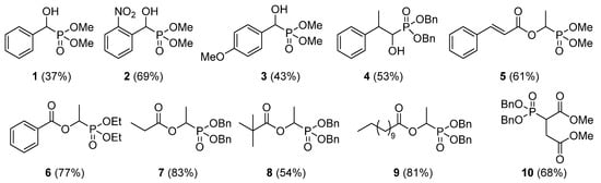 As a continuation of our research on sustainable protocols, [50,51,52,53] we paid attention to find an environmentally friendly method for desired α-hydroxy phosphonates 1–4 [16] and α-acyloxy phosphonates 5–10 (Figure 2).