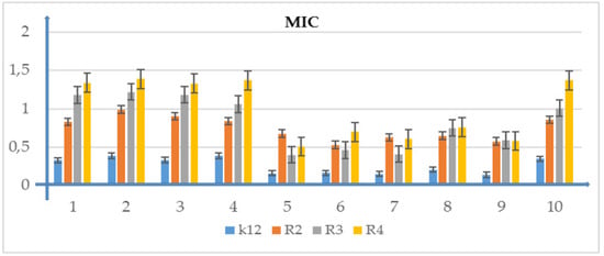 Minimum inhibitory concentration (MIC) of the phosphonate derivatives in model bacterial strains. The x-axis features compounds 1–10 used sequentially. The y-axis shows the MIC value in µg/mL−1. Investigated strains of E. coli K12 as control (blue), R2 strains (orange), R3 strain (grey), and R4 strain (yellow). The y-axis shows the MBC value in µg/mL−1. The order in which the compounds were applied to the plate is shown in Supplementary Materials Figure S1.