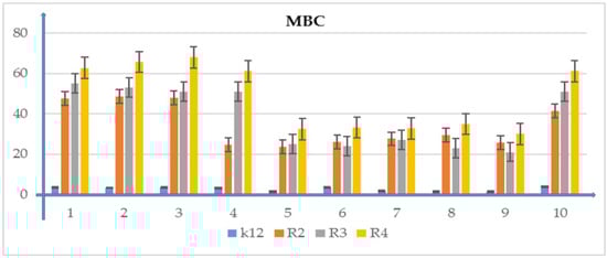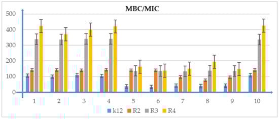 The ratio of MBC/MIC of the phosphonate derivatives. The x-axis features compounds 1–10 used sequentially. The y-axis shows the MIC value in µg/mL−1. Investigated strains of E. coli K12 as control (blue), R2 strains (orange), R3 strain (grey), and R4 strain (yellow). The y-axis shows the MBC value in µg/mL−1. The order in which the compounds were applied to the plate is shown in Supplementary Materials Figure S1.