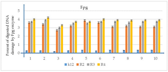 Percentage of plasmid DNA recognized by Fpg enzyme (y-axis) with model bacterial, K12, and R2–R4 strains (x-axis). All analyzed compounds numbered were statistically significant at <0.05 (see Table 2 and Supplementary Materials Figure S2 panel A and B).