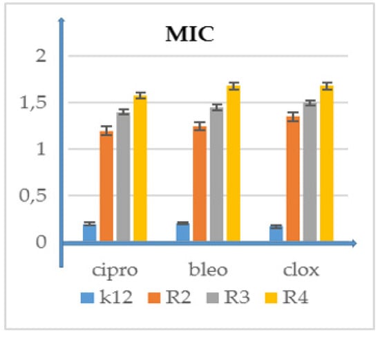 Examples of MIC with model bacterial strains K12, R2, R3, and R4 for studying antibiotics ciprofloxacin (cipro), bleomycin (bleo), and cloxacillin (clox). The x-axis features antibiotics used sequentially. The y-axis features the MIC value in µg/mL−1. Supplementary Materials Figure S1.