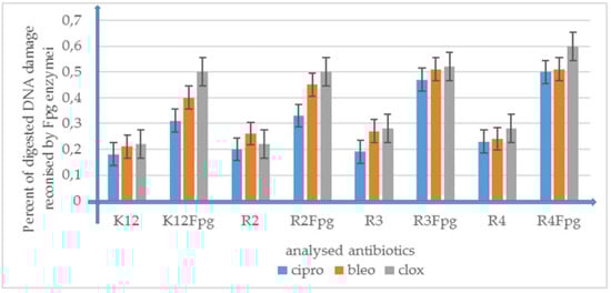 Percentage of bacterial DNA recognized by Fpg enzyme in model bacterial strains after ciprofloxacin, bleomycin, and cloxacillin treatment. The compounds were statistically significant at p < 0.05. (See Supplementary Materials Figure S3).