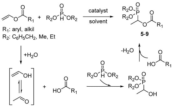 Considering the impact of solvent on enzyme stability it can change reactivity of enzyme [56]. To find the efficient medium, we conducted the model reaction in various solvents; tert-butyl methyl ether (TBME), dimethyl sulfoxide (DMSO), tetrahydrofuran (THF), dichloroethane (DCM), and toluene. The obtained results revealed that the solvent have significant effects on CcL activity. As shown in Table 1, the lipase from Candida cylindracea was active in all tested solvents, and the non-protic solvents such as n-hexane and TBME were found to be more suitable. Therefore, n-hexane was applied in the following process. Obtained results remain in agreement with the literature data for enzymatic aza-Michael addition [54]. In the next step, the impact of enzyme quantity was investigated. A slight increase in yield of target compound 5 was noticed by raising the amount of CcL from 80 mg to 100 mg. Thus, the further reactions were conducted with 80 mg of CcL. Enzyme activity and stability are strongly associated with the temperature of reactions [52]. To verify the effect of temperature, we conducted model reaction in temperature from 30 °C to 50 °C; however, the yield was reduced above 40 °C, which may be due to changes in the quaternary structure of the used enzyme (Table 1, entries 8 and 9). It is noteworthy to mention that the studied addition reaction catalyzed by CcL afforded no by-products resulting from anti-Markovnikov addition or hydrolysis. Unfortunately, obtained chiral product exhibited low or no optical activity what remains in agreement with literature data regarding lipase catalyzed Michael-type additions [43] or Markovnikov addition of thiols and amines to vinyl esters [45,46,47,48]. Due to the fact that the target α-acyloxy phosphonates (Figure 2) under studied conditions can be formed in two different ways: by the direct addition of H-phosphite to the double bond or by the enzymatic cascade reaction involving α-hydroxy phosphonate synthesis [16] from acetaldehyde derived from vinyl ester hydrolysis via enzyme catalyzed Pudovik reaction and further esterification with carboxylic acid. Additional experiments under reaction course were performed. Under the developed conditions, neither the formation of the α-hydroxy phosphonate nor enzymatic esterification was noticed. The obtained results allow to state that we are dealing with a direct H-phosphite addition reaction to vinyl ester.