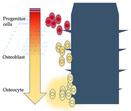 The bone neoformation process adheres to all the stages that influence direct ossification: arrival of bone cells, deposition of osteoid tissue and formation of immature bone with interwoven fibers. The immature bone is then resorbed and substituted with mature lamellar bone; this event then guides the formation of new bone around the fixture [9,10,11] (Figure 1).