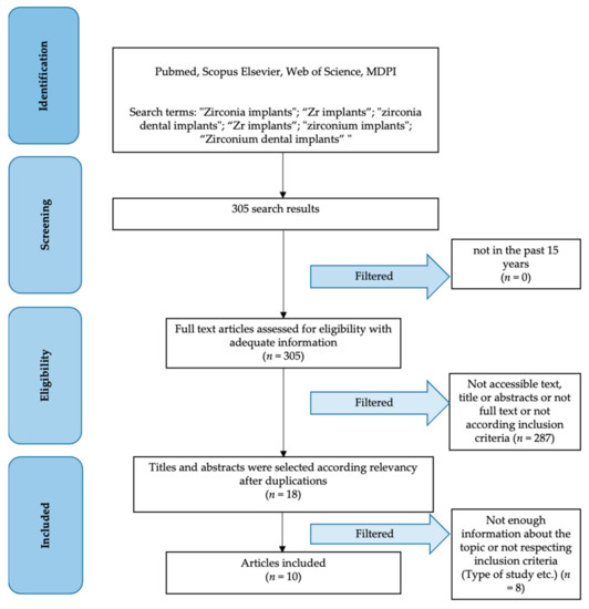 In the search strategy, it was not considered to include the word “titanium” (concerning titanium implants), in order to obtain only RCTs that would compare zirconia vs. titanium implants. Furthermore, recent works were considered, in accordance with inclusion and exclusion criteria, and only some types of studies were selected, using the filters already present in the scientific information sources.