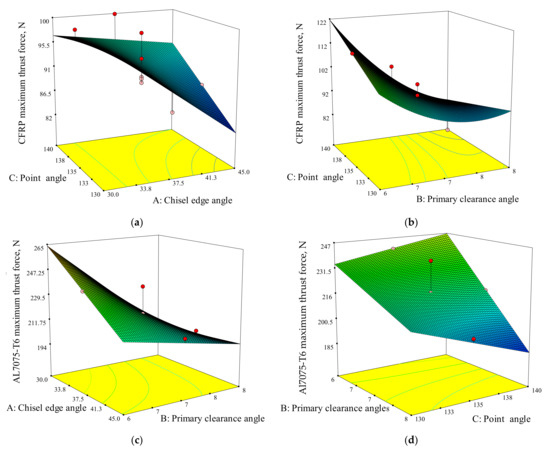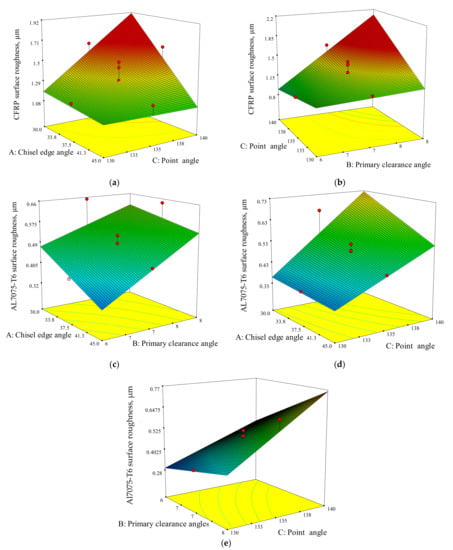 9]. When drilling the CFRP panel with a metal stack, the most suitable drill geometry, which is a compromise of the needs of each material, must be applied to optimally drill the stack material, especially during a single-shot drilling process. In order to guarantee the machining quality and the surface integrity, the selection of both the optimal cutting parameters, namely feed rate and spindle speed, is required, as well as appropriate drill geometries such as drill diameter, chisel edge angle, primary clearance angle, or point angle.