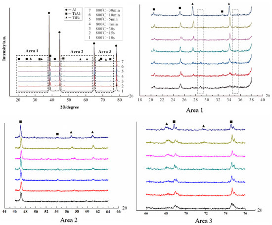 The XRD spectra at 800 °C for different reaction times are shown in Figure 2 to further confirm the “rich Ti, B area”. The main phases of all samples were Al, TiAl3, and TiB2, and no prominent excess peaks were observed. The intensity of the TiAl3 peak is basically the same from 10 S to 1800 S, which indicates that TiAl3 generated at the initial stage of the halide salt reaction. The TiB2 peak obviously changed from weak to strong. There is no TiB2 peak in the XRD pattern at 10 S and a weak TiB2 peak appears at 15 S, thus indicating that the formation of TiB2 is slower than that of TiAl3 or it generates too little to detect in the early stage. The TiB2 and AlB2 have a similar crystal structure, and thus, diffraction peaks may be broadened or separated in XRD diffraction. If the value of Ti/B is greater than 2.2, then excess B will form AlB2 [27]. Therefore, the peaks in the two square frames in Area1 were considered to be AlB2, which are very close to the strong peak of TiB2. A small amount of AlB2 also exists in the early stage of the reaction. Some studies have reported the nonhomogenous distribution of solutes B and Ti close to the salts/Al melt interface during the reaction of the fluoride salts and Al melt. These form unstable AlB2. The AlB2 transforms to TiB2 via diffusion of solutes Ti and B in the aluminum melt in the subsequent holding temperature process [28,29]. The essence of filamentous areas (Figure 1a) is a complex compound (Tix, Al1−x)By; this area was called the “rich Ti, B area”. In the early stage of the halide salt reaction, the streamlined “rich Ti, B area” existed in the aluminum melt (Figure 1a). The formation of TiAl3 was very fast (less than 10 S). The “rich Ti, B area” was the birthplace of the nucleation and growth of initial TiAl3 and TiB2 for the halide salt route.